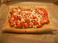 6) Arrange the tomatoes, feta, and Parmesan over the tart.